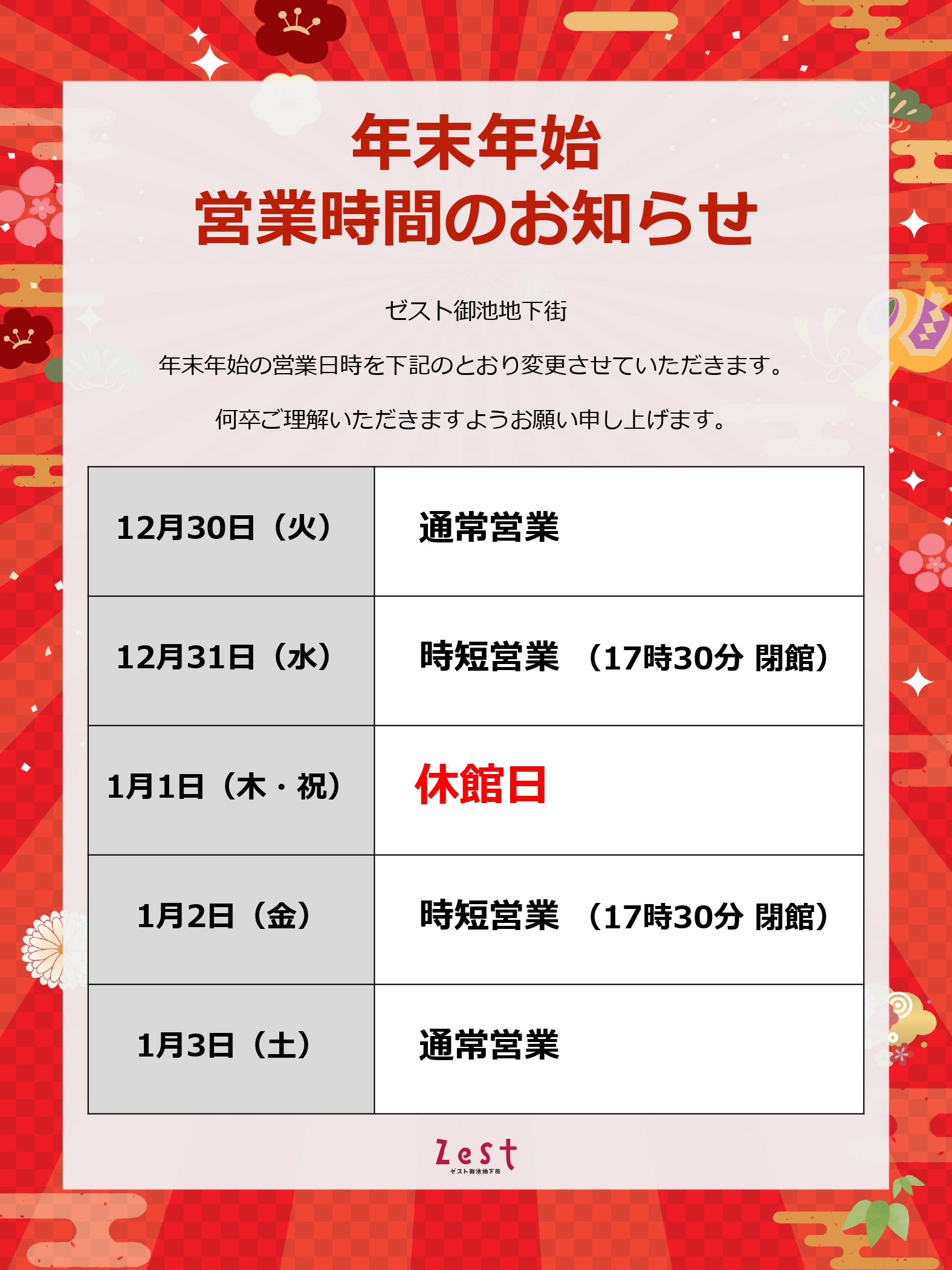 2025年は、ゼスト御池をご愛顧下さいまして、誠にありがとうございました。