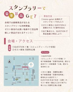 QUESTION会場とゼスト御池地下街を巡りスタンプを集めることで、ゼスト御池地下街で使える商品券や出店者による工芸品・こだわり商品が当たる抽選に参加可能。スタンプカードは「mono-gatari 2026」 会場内、また一部スタンプ設置箇所にて配布しています🎵