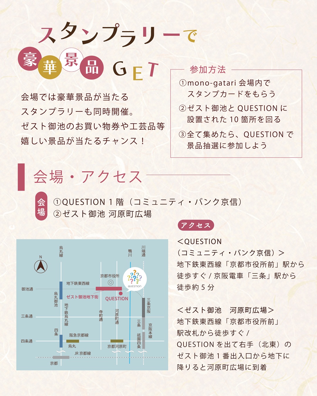 会場内では参加無料で、総額3万円分のゼスト御池商品券や、工芸品が当たるスタンプラリー&抽選会も開催!ゼスト御池とQUESTIONを行き来しながら10箇所のスタンプを集めて景品をGETしよう📍🚶♀️