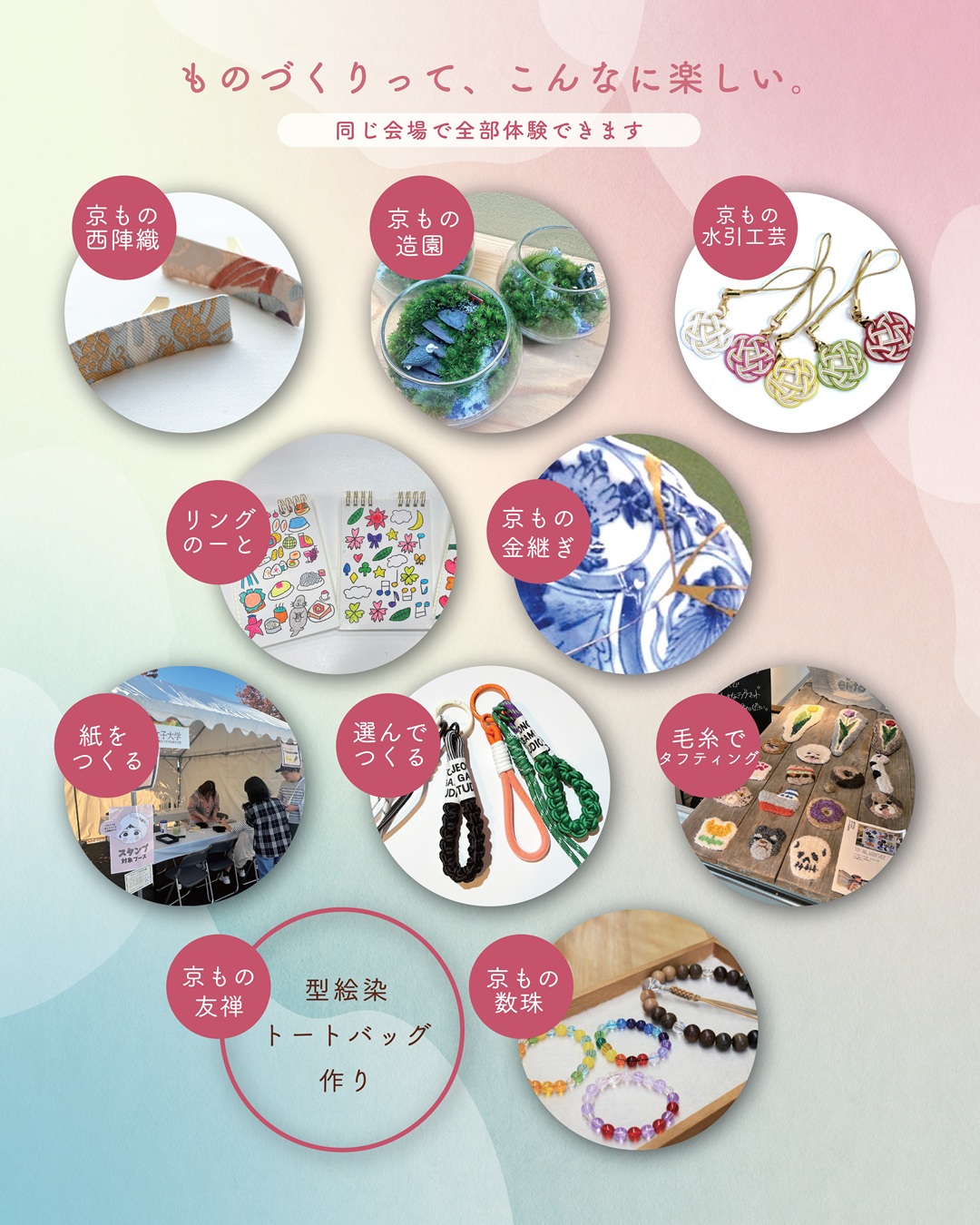 つくって、たべて、話して、まるっと充実の1日を🌷✂️🍴体験型マルシェ「mono-gatari 2026」が3月7日(土)10:00-17:00に京都市役所前駅直結のゼスト御池河原町広場とQUESTION1階で開催🎉伝統工芸を含む10種類の体験と、物販、地域の人気飲食店が出店🚗本格的な金継ぎ体験から子どもも一緒に楽しめるリングノート作りまで、つくって、楽しんで、日常使いできるアイテムが満載です👀